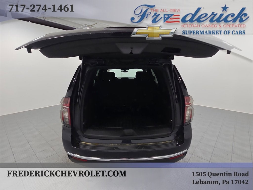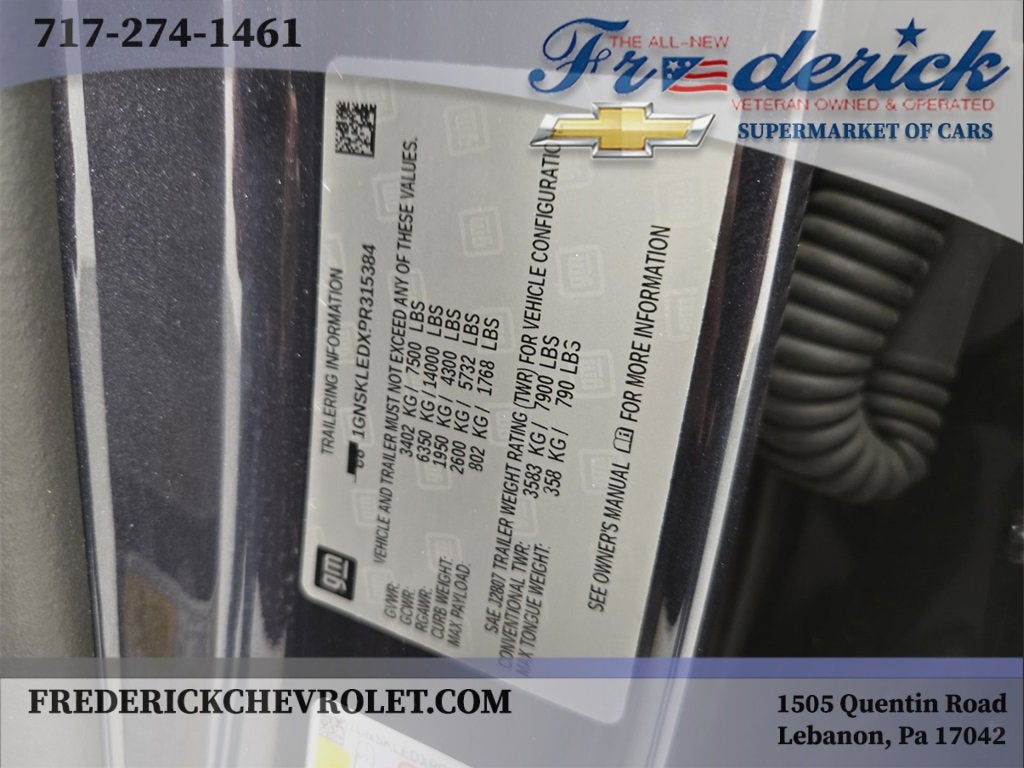 We have included a list of the standard and optional equipment below:Preferred Equipment Group 1FL, 4WD, Black Cloth, 3.23 Rear Axle Ratio, 3rd Row Passenger Seat Delete, 3rd row seats: split-bench, 4-Wheel Disc Brakes, 6 Speakers, 6-Speaker Audio System Feature, ABS brakes, Air Conditioning, Alloy wheels, AM/FM radio, Apple CarPlay/Android Auto, Automatic temperature control, Brake assist, Bumpers: body-color, Compass, Delay-off headlights, Driver door bin, Driver vanity mirror, Dual front impact airbags, Dual front side impact airbags, Electronic Stability Control, Emergency communication system: OnStar and Chevrolet connected services capable, Four wheel independent suspension, Front 40/20/40 Split-Bench Seat, Front anti-roll bar, Front Center Armrest, Front dual zone A/C, Front reading lights, Fully automatic headlights, Heated door mirrors, Illuminated entry, Infotainment Display, Low tire pressure warning, Luggage Rack Side Rails Delete, Occupant sensing airbag, Outside temperature display, Overhead airbag, Overhead console, Panic alarm, Passenger door bin, Passenger vanity mirror, Power door mirrors, Power driver seat, Power passenger seat, Power steering, Power windows, Premium Cloth Seat Trim, Premium Smooth Ride Suspension, Radio: Chevrolet Infotainment 3 System, Rain sensing wipers, Rear air conditioning, Rear anti-roll bar, Rear reading lights, Rear seat center armrest, Rear window defroster, Rear window wiper, Remote keyless entry, Remote Start, Roof rack: rails only, Security system, Speed control, Speed-sensing steering, Split folding rear seat, Spoiler, Steering wheel mounted audio controls, Tachometer, Telescoping steering wheel, Tilt steering wheel, Traction control, Trip computer, Variably intermittent wipers, Voltmeter, Wheels: 18 x 8.5 Bright Silver Painted Aluminum, and Wheels: 20 x 9 Painted Aluminum.